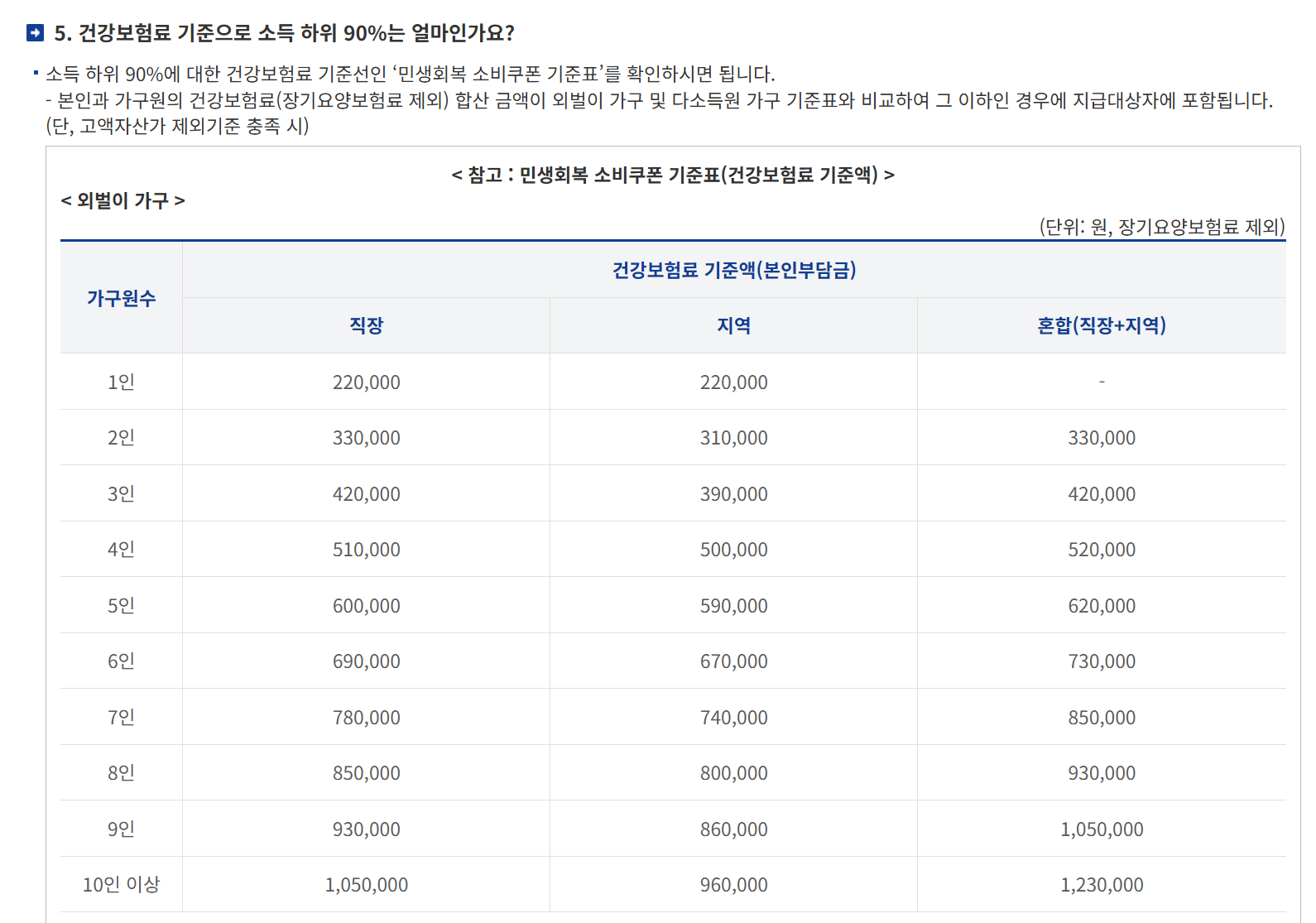 특히 외벌이 가구와 다소득원 가구에 따라 적용되는 건강보험료 기준이 다르므로, 본인 가구 형태에 따라 기준표를 반드시 확인해야 합니다. 또한 고액자산가에 해당하는 경우, 즉 재산세 과세표준이 12억 원을 초과하거나 금융소득이 2천만 원을 초과하는 가구는 지급 대상에서 제외됩니다.