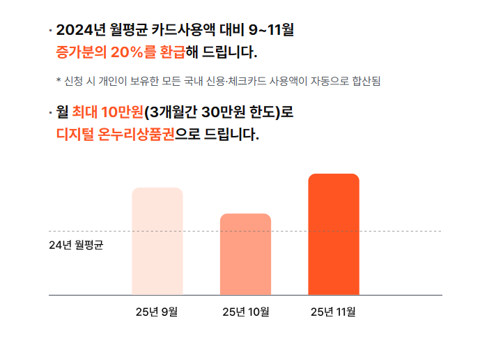예를 들어, 2024년 월평균 카드 사용액이 100만 원이었다면, 2025년 9월에 130만 원을 사용한 경우 증가분 30만 원의 20%인 6만 원을 온누리상품권으로 환급받게 됩니다. 월 최대 환급 한도는 10만 원이며, 3개월 동안 최대 30만 원까지 받을 수 있습니다.