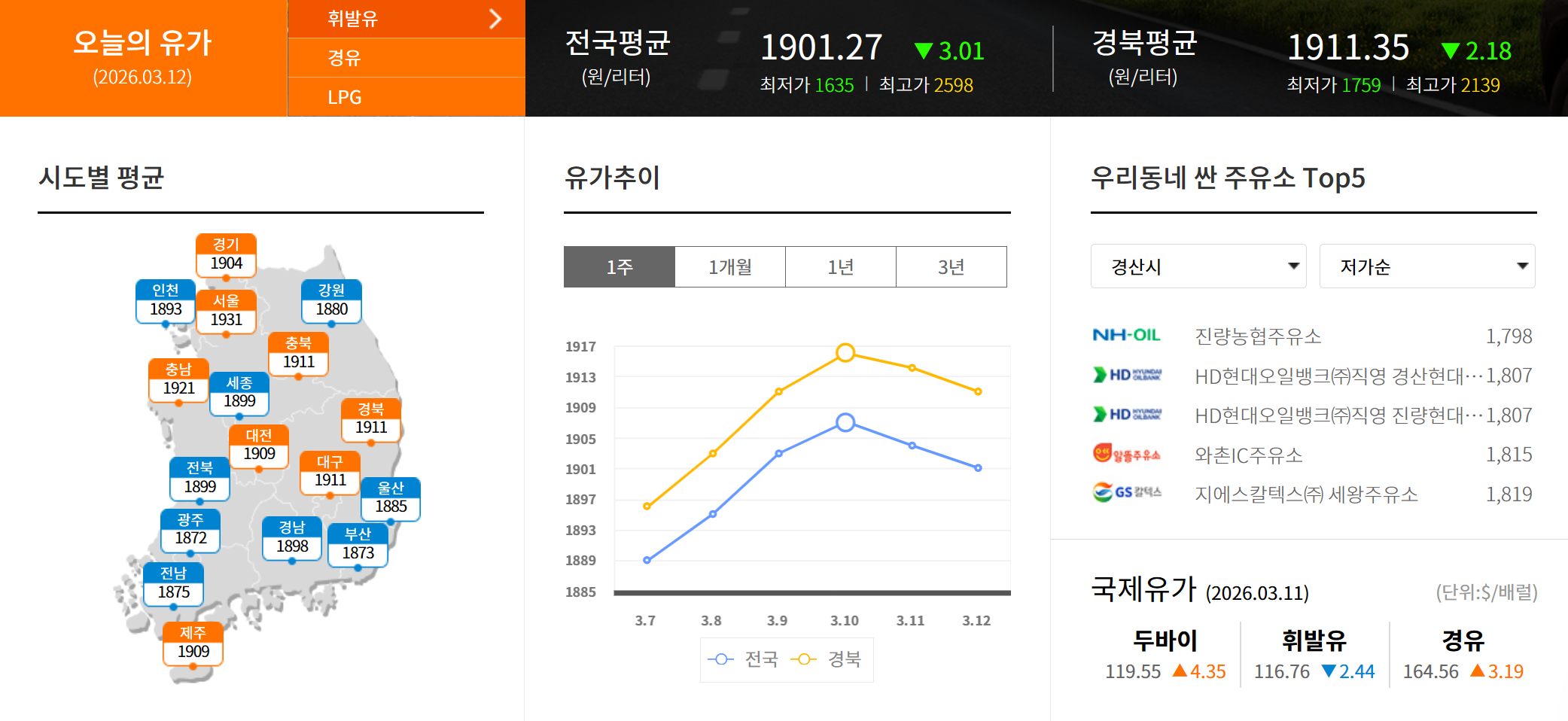 주유소에서 신고한 가격 정보를 기반으로 제공되기 때문에 비교적 정확한 편입니다. 다만 실제 주유소 상황에 따라 가격이 일부 다를 수 있습니다.