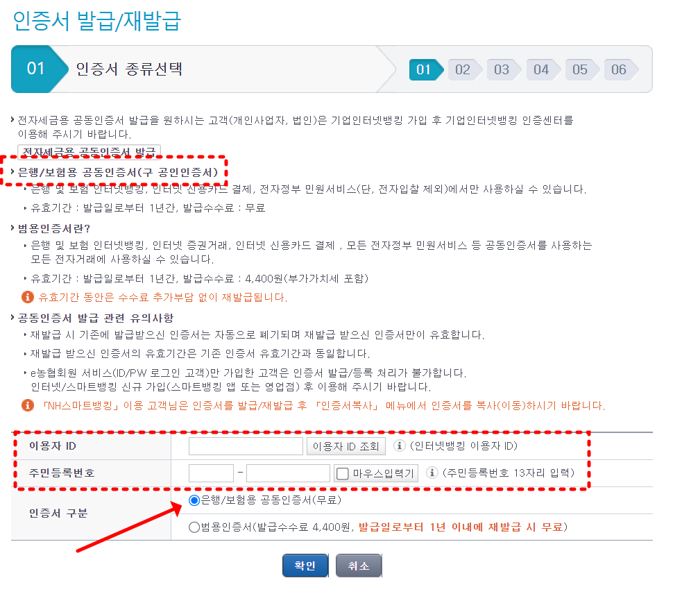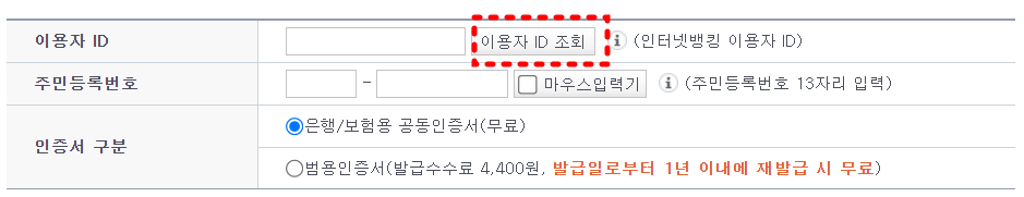 이용자 ID와 주민번호를 넣고 하단에 있는 '확인'을 눌러주면 공인인증서 발급화면이 나오며 쉽게 발급이 가능합니다.