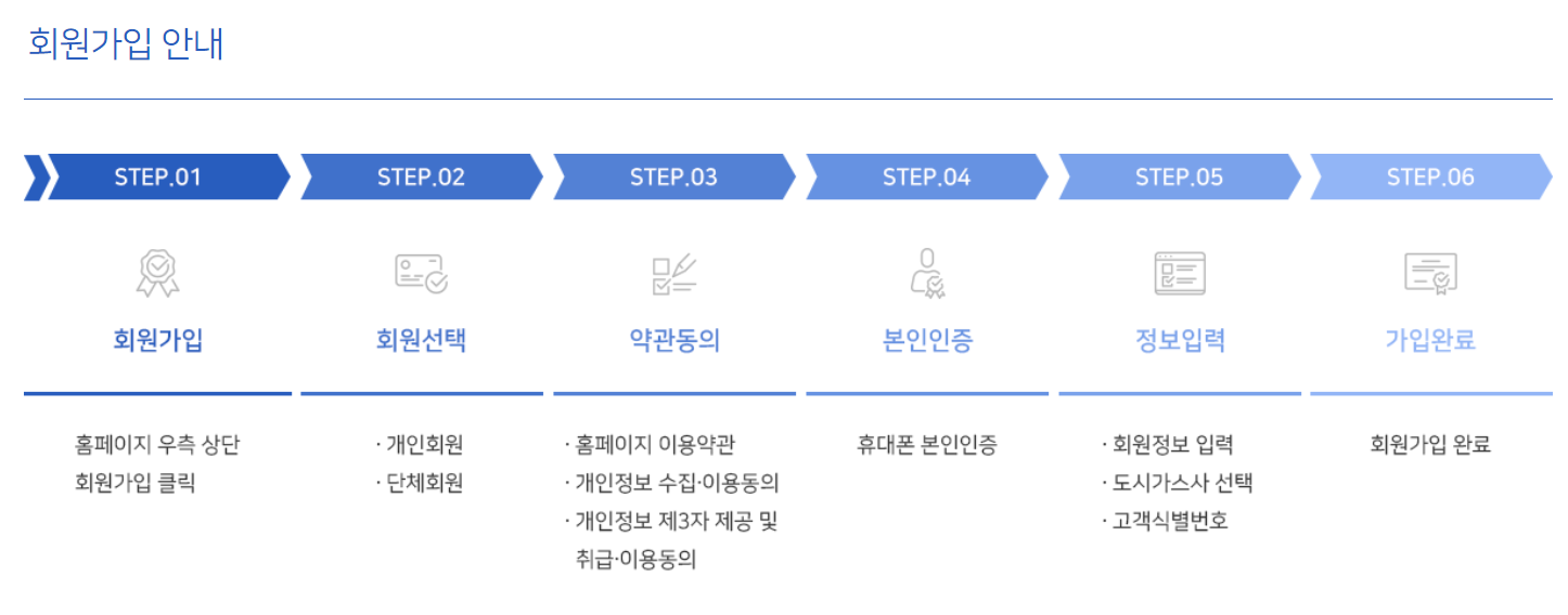 회원가입 시 미리 준비해야 될 사항이 있는데요 바로 본인이 이용하는 도시가스사의 명과 본인의 납부자번호입니다. 이를 모르면 회원가입이 불가능하기 때문에 미리 준비하시면 되며