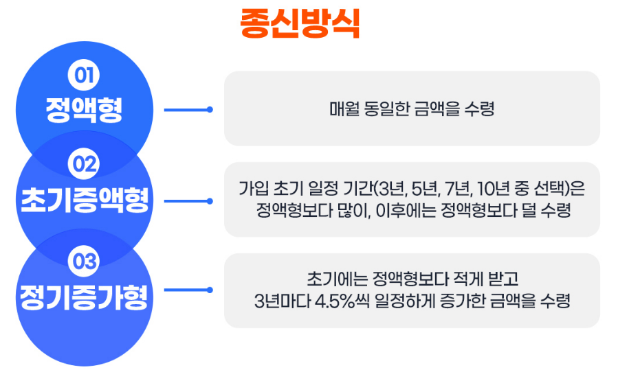 종신방식은 매 월 연금으로 수령하는 방식이며, 여기서 또 정액형, 초기증액형, 정기증가형으로 선택 가능합니다.