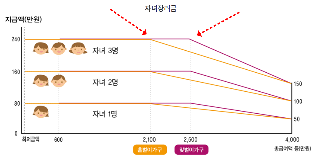 총소득이 많을 수록 감액되는 구조이며 자녀 1인당 최소 50만원에서 ~ 최대 80만원까지 지원합니다.