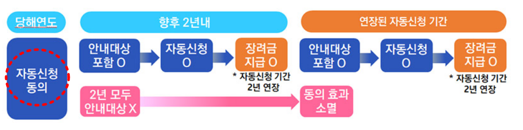 장려금 신청 시 '자동신청'에 동의를 하면 향후 2년 내에 신청 안내대상에 포함된다면 장려금이 자동으로 신청됩니다. 자동 신청된 장려금을 받으면 자동신청 기간이 또 2년 연장되므로 계속 편리하게 이용 가능합니다.