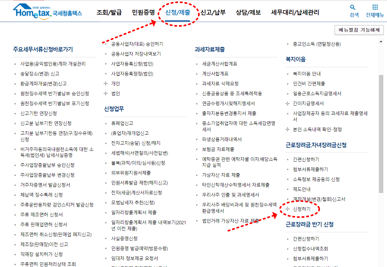 국세청 홈페이지로 접속해서 상단 메뉴 중 '신청/제출'에서 우측 하단에 있는 '근로장려금 신청하기'를 누릅니다.