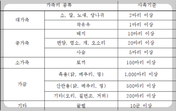※가축이나 곤축 생산 등은 가축사육업을 등록하고 일정 면적 이상에서 정해진 사육규모 이상으로 사육해야 합니다.