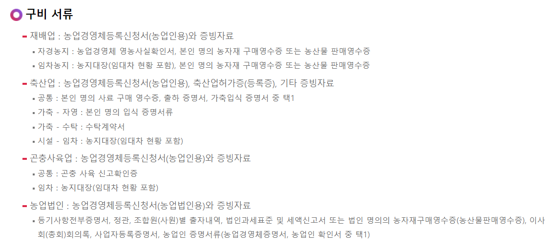 2. 축산업: 농업경영체등록신청서(농업인용), 축산업허가증(등록증) 및 기타 증빙자료