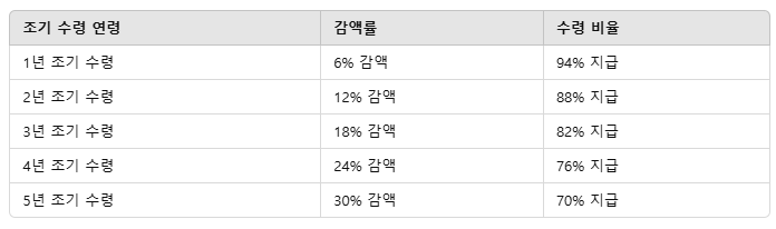 1년 조기 수령 시 6% 감액되며, 월 단위로 0.5%씩 감액됩니다. 예를 들어, 원래 연금을 65세에 수령해야 하는 1969년생이 60세에 조기 수령한다면 30% 감액된 연금액을 받게 됩니다.
