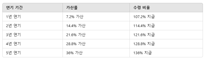 1년 연기 시 연금액이 7.2% 인상되며, 월 단위로 0.6%씩 증가합니다. 최대 5년 연기할 경우, 원래 연금액의 36%가 추가로 지급됩니다.