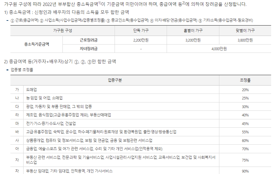 자녀장려금 신청 대상자는 상기 총소득 항목 중 근로와 사업소득만을 합한 금액에 따라 장려금을 받게 됩니다. 이 때, 사업소득은 업종별로 다른 조정률이 적용됩니다