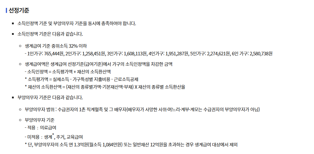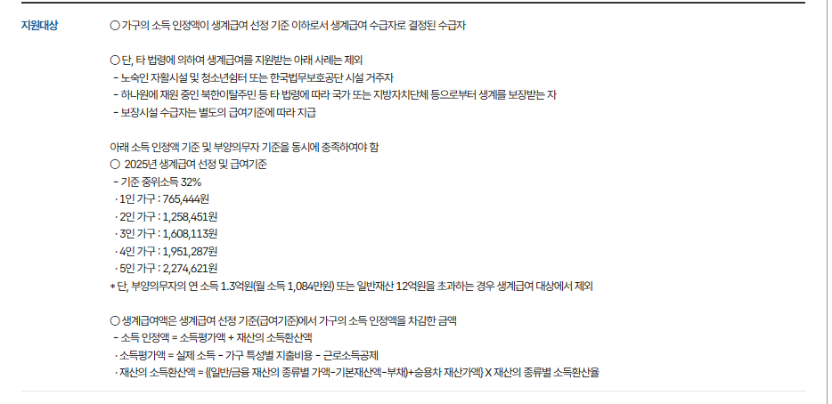 기존에는 부양의무자의 소득과 재산이 일정 기준을 초과할 경우 생계급여를 받을 수 없었으나, 2025년부터는 완화되었습니다.