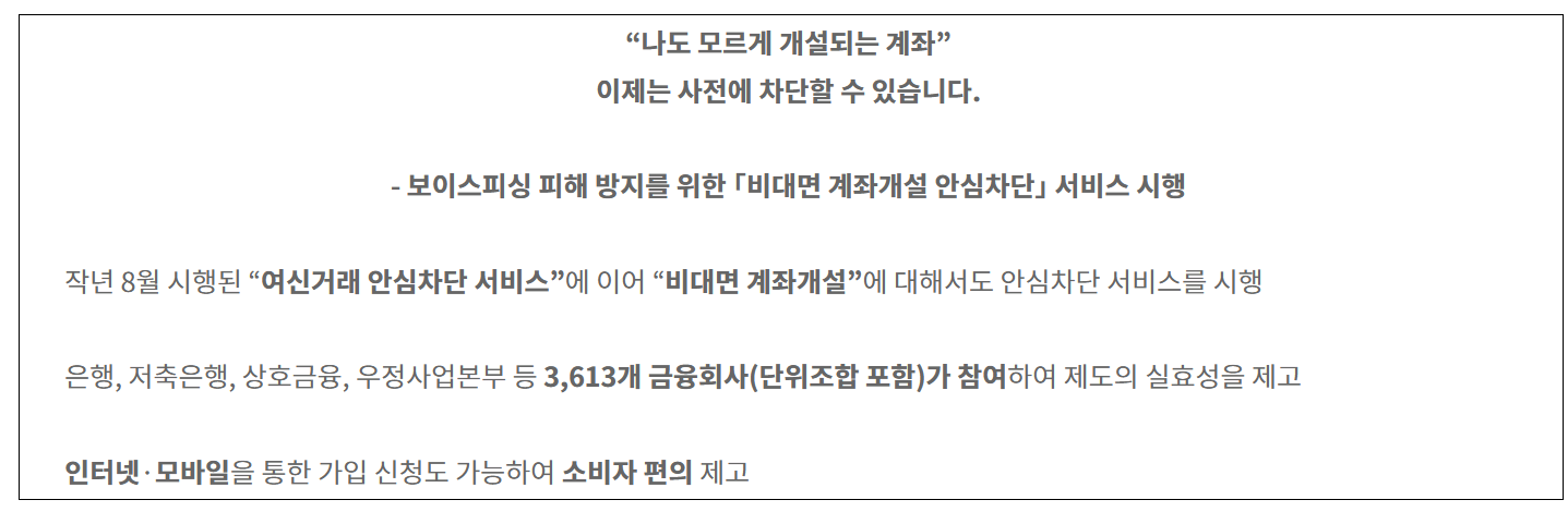보이스피싱 피해를 사전에 차단할 수 있는 강력한 서비스, ‘비대면 계좌개설 안심차단’ 서비스는 한국신용정보원에 정보를 등록하여, 본인의 동의 없이 비대면으로 수시입출식 계좌가 개설되는 것을 원천 차단할 수 있는 제도입니다. 특히 보이스피싱, 스미싱, 명의도용 등 각종 금융범죄 예방에 탁월한 효과를 발휘하고 있어 많은 금융소비자들이 적극적으로 활용하고 있습니다.