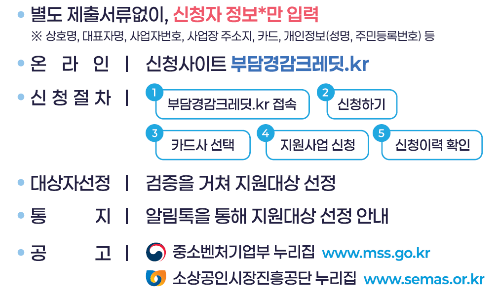 온라인 신청만 가능하며, 부담경감크레딧.kr 또는 소상공인24에서 신청하실 수 있습니다.