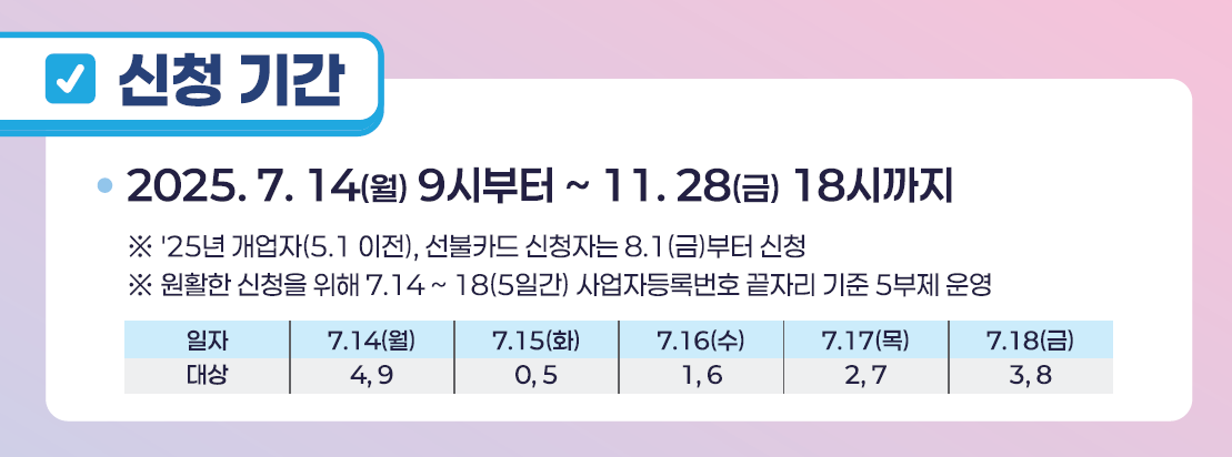 2025년 7월 14일(월) 오전 9시부터 11월 28일(금) 오후 6시까지 신청 가능하며, 예산 소진 시 조기 마감될 수 있습니다. 단, 2025년 개업자 및 선불 신청자는 8월 1일부터 신청이 가능합니다.