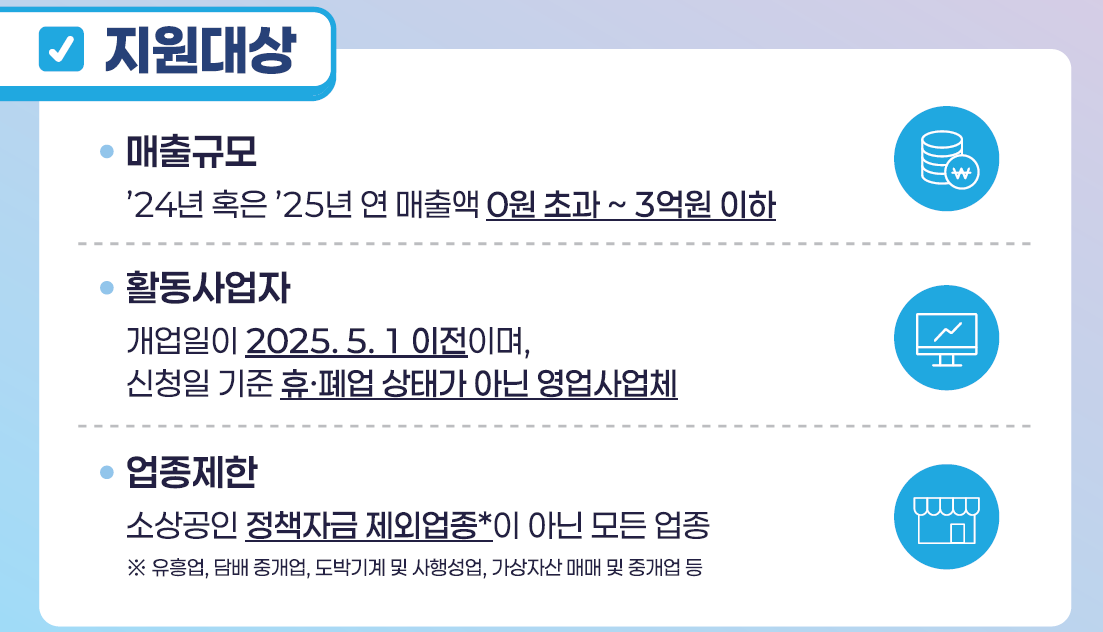 첫째, 2024년 또는 2025년의 연 매출액이 0원을 초과하고 3억원 이하일 것. 둘째, 신청일 기준 영업 중이며 국세청에 휴·폐업 신고가 되어 있지 않을 것. 셋째, 개업일이 2025년 5월 1일 이전일 것.