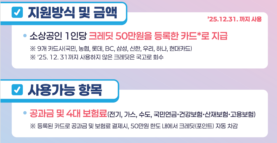 크레딧은 공과금(전기, 가스, 수도요금) 및 (국민연금, 건강, 고용, 산재) 납부에만 사용 가능합니다. 음식점, 마트 등 일반 업종에서는 사용할 수 없습니다.