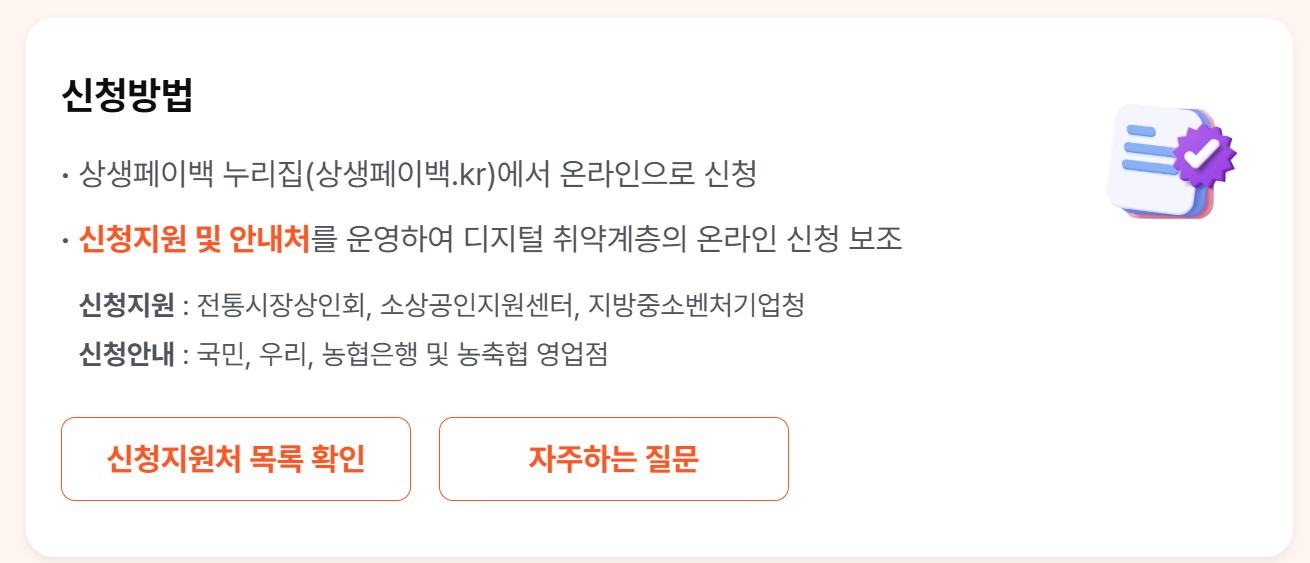 온라인 신청은 전용 누리집을 통해 가능하며, 오프라인 신청은 전통시장 상인회, 소상공인지원센터 등에서 할 수 있습니다. 은행 영업점에서도 안내를 받을 수 있어 접근성이 높습니다.